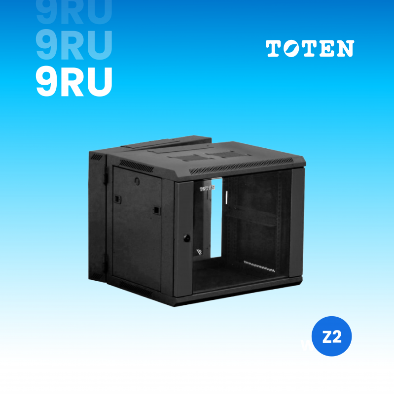 Gabinete de pared de 9 RU pivotable, fabricado en acero SPCC con puerta de vidrio templado. Ofrece fácil acceso posterior, optimiza el mantenimiento y cumple normas internacionales como ANSI/EIA RS-310-D e IEC297-2.