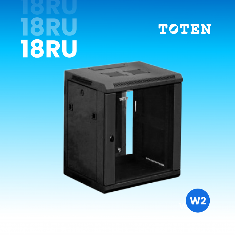 Gabinete diseñado para montaje de pared 18RU W2.6418.9001, con estructura soldada y confiable. Cuenta con instalación estándar de 19” y cumple con normas internacionales como ANSI/EIA RS-310-D, IEC297-2 y DIN41494. Su diseño permite una instalación eficiente y segura.