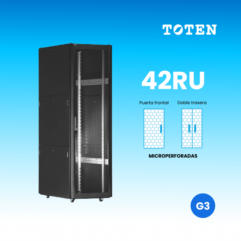 Diseñado para rendir al máximo. Este gabinete de piso Toten de 42 RU combina capacidad, ventilación eficiente y un diseño funcional que facilita el mantenimiento. Ideal para instalaciones exigentes, cumple con normas internacionales clave.